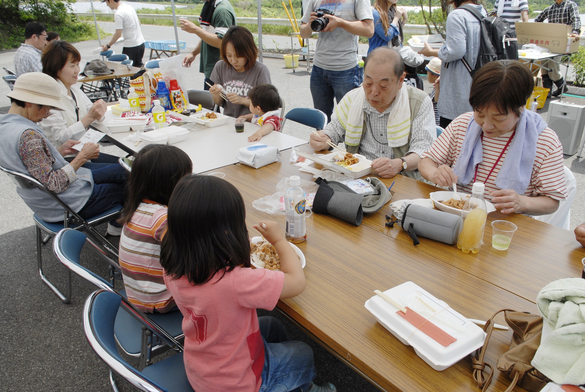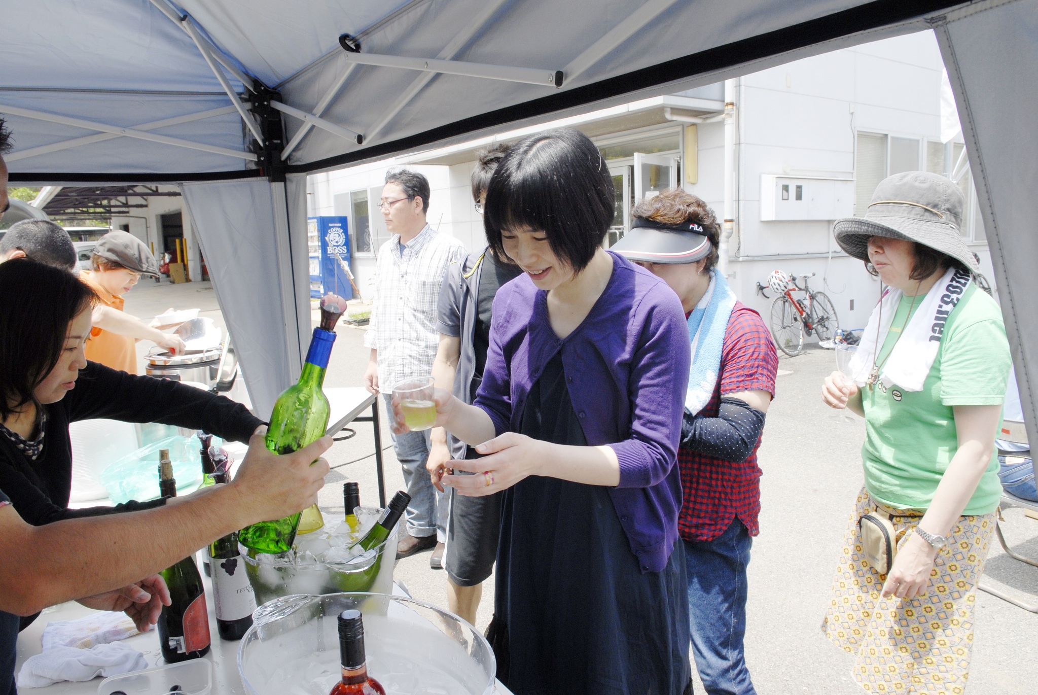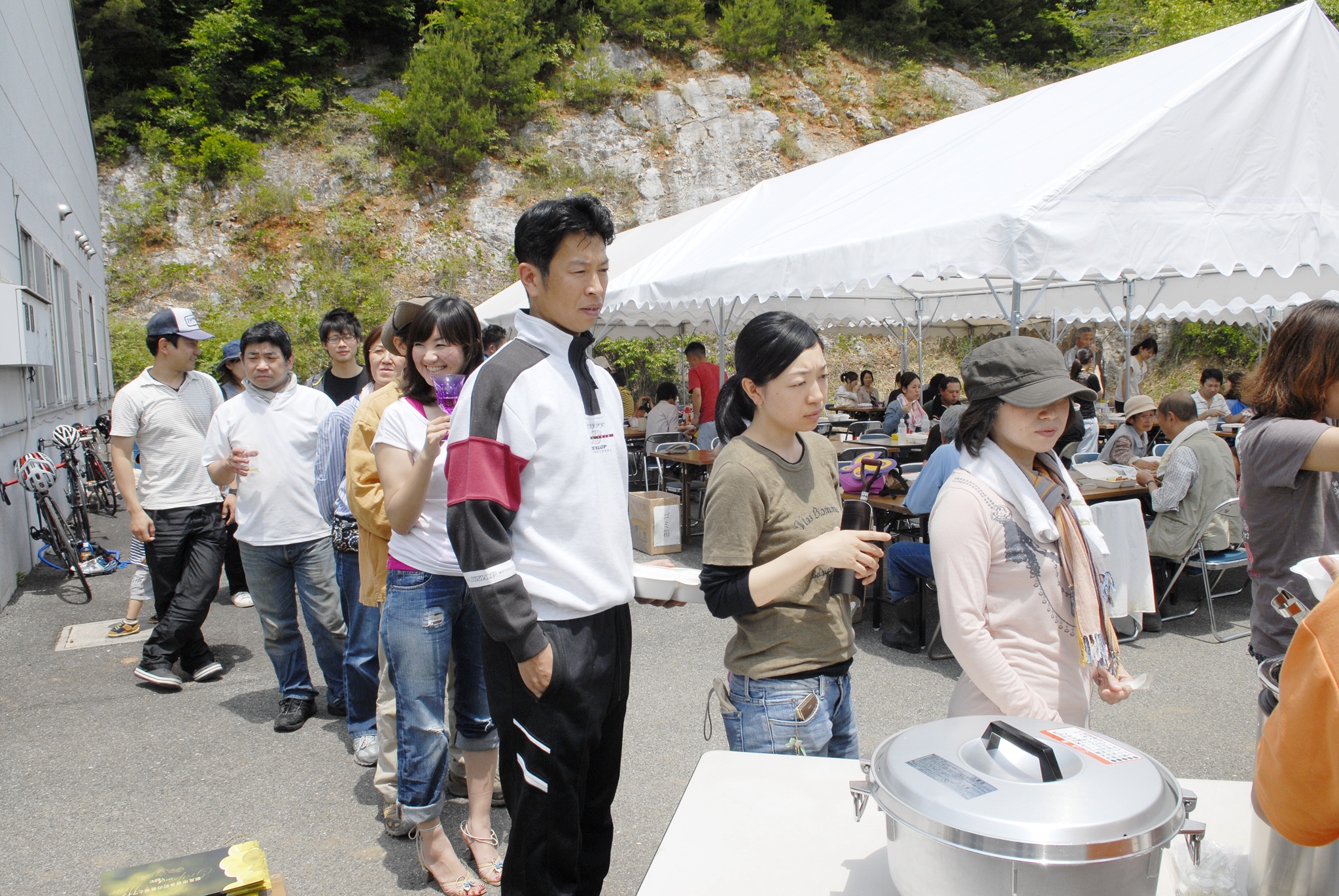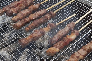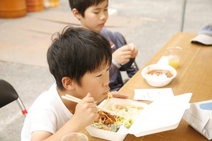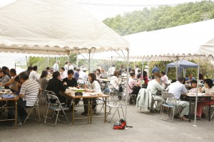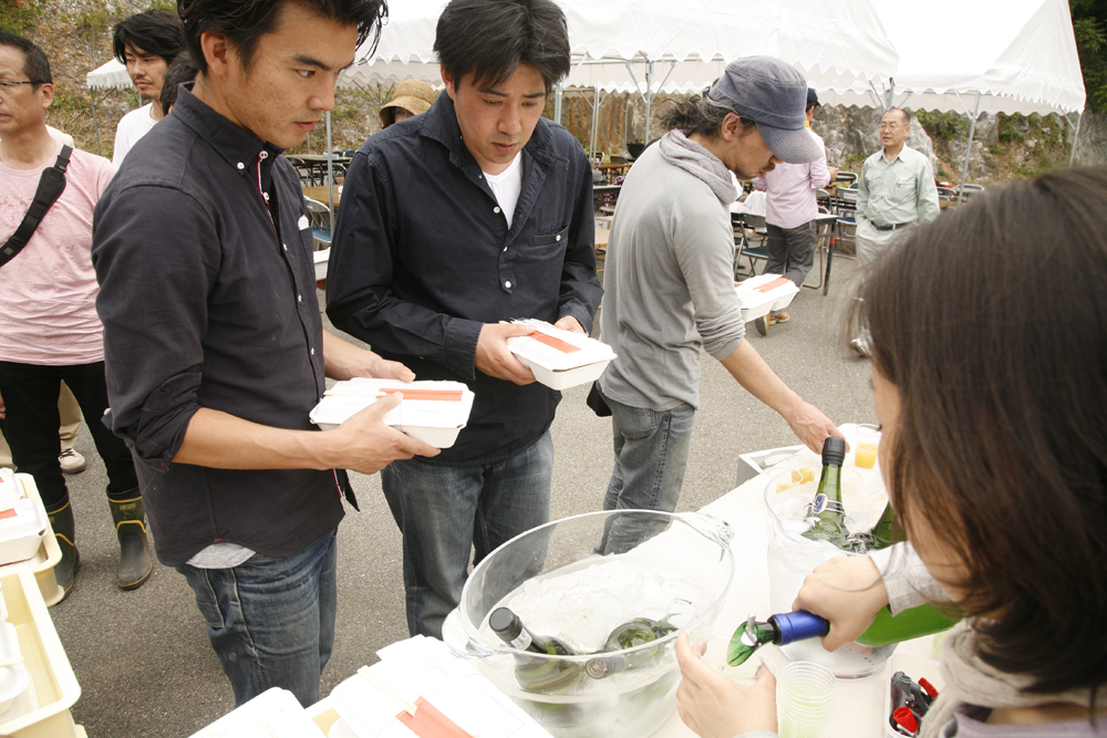 2012新植祭レポート №4 ランチ編 投稿日:2012年8月31日 作成者: admin 午前中で作業が終わり、ランチタイムです。 今年のランチもきらりカフェ(哲西町)にお願いしました。 山羊ミルクを使ったピラフがメインです。 ランチBOXを貰うための長蛇の列です。 もちろんワインもありました。が、予想以上の賑わいで全くワインが足りませんでした。スイマセンでした。 サプライズは、千屋牛の串焼き。 A5クラスの最高品質の串焼きです。
