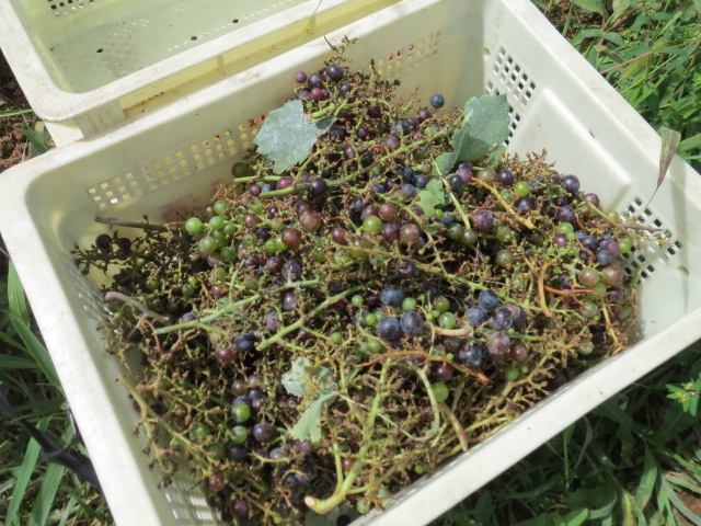 8/20 イノシシ被害 投稿日:2012年8月20日 作成者: admin またイノシシに食べられました。 メルロなんですが20kgぐらい食べられました。ボトルにすると約20本ぐらい。 今までメルロ圃場にはイノシシが来なかったので電柵設置を先延ばしにして今日設置する予定でした。 まぁこれも動物との共存なので自然のことですね。 大きな被害にならかったので良かったです。